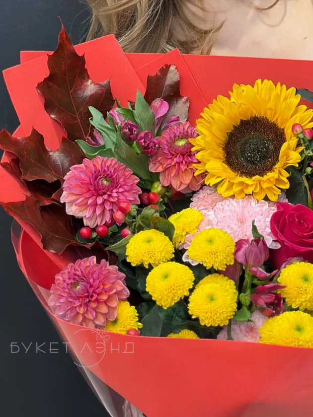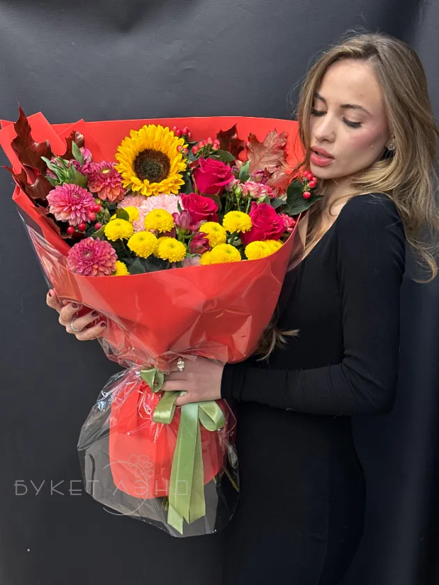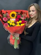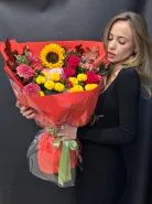 Этот букет представляет собой яркое и гармоничное сочетание цветов и зелени, которое привносит в атмосферу радость и свежесть.