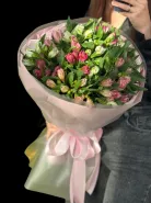 Пышная зелень, красивые цветы и оформление придают букету элегантность, а легкий аромат наполняет пространство свежестью.