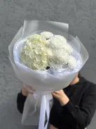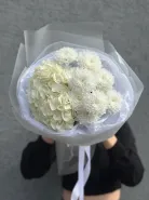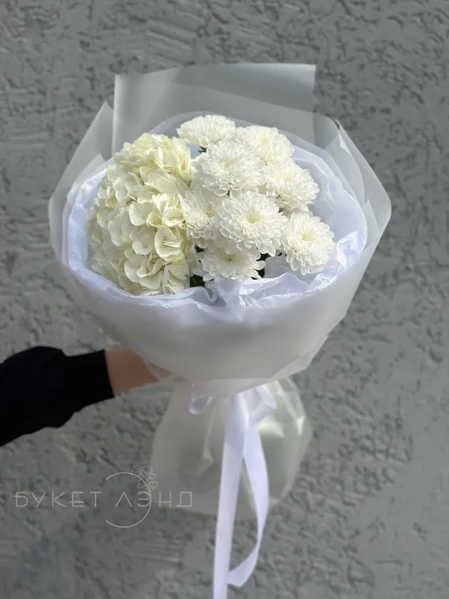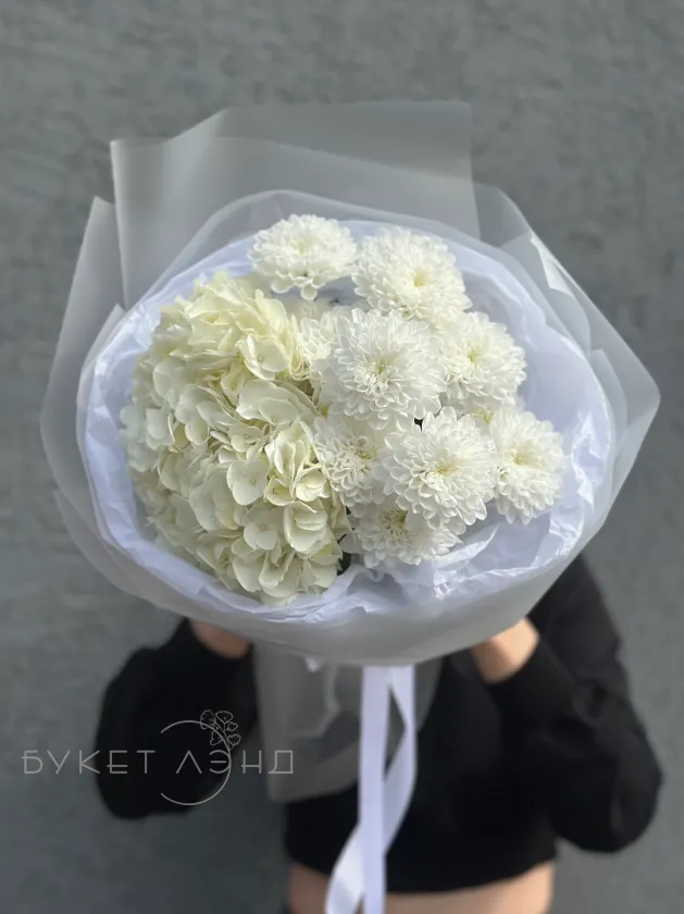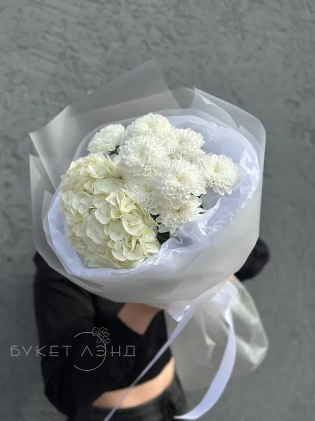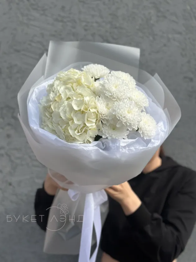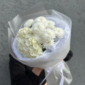 Сборный и нежный букет из хризантемы и гортензии в оформлении - идеальный подарок для себя и близких людей!