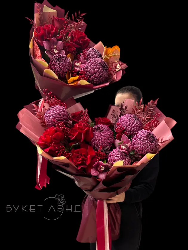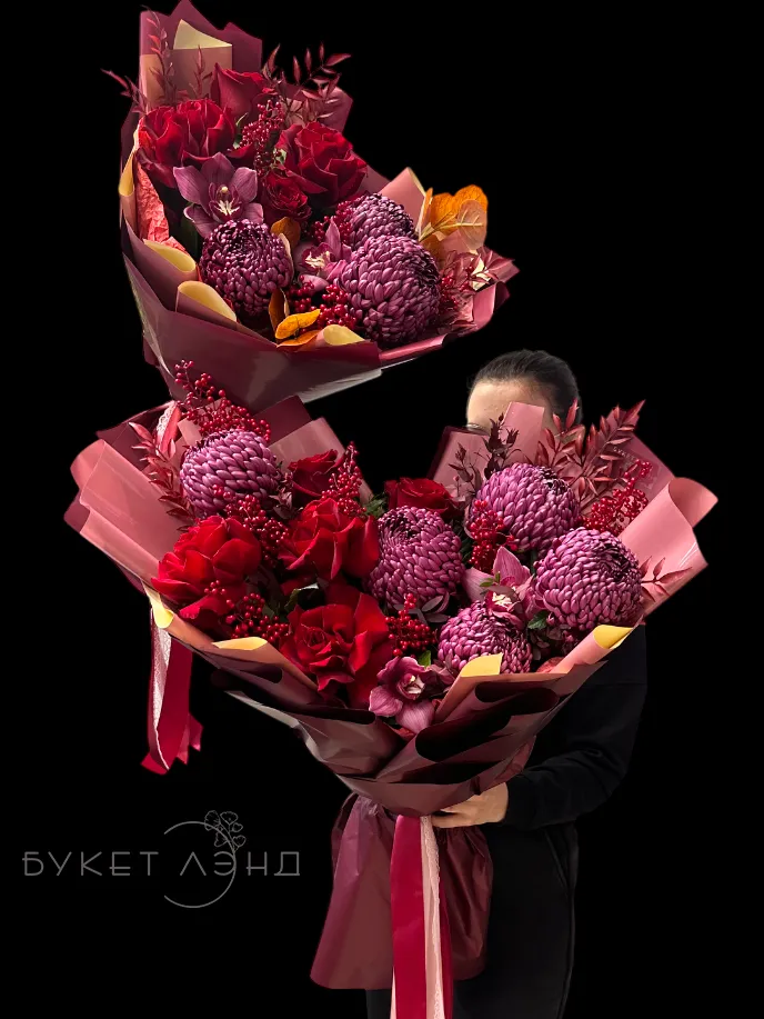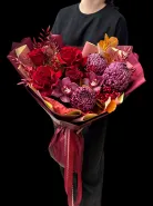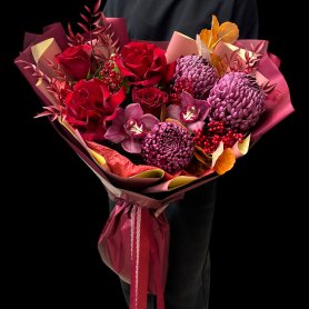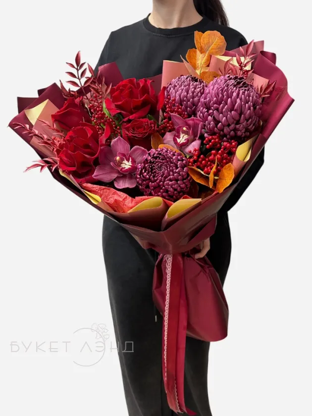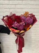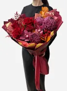 Этот сборный букет — идеальное решение для тех, кто ценит красоту и оригинальность. В его составе элитные цветы: хризантема, роза и цимбидиум, создающие насыщенную и гармоничную палитру. В букет добавлены искусственные ветки, ягоды и эвкалипт, придающие композиции объем. Каждый элемент тщательно подобран для создания уникального образа. Этот сборный букет — это сочетание эстетики, долговечности и уникального дизайна, которое подчеркнет ваш особый вкус.