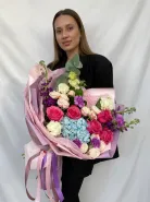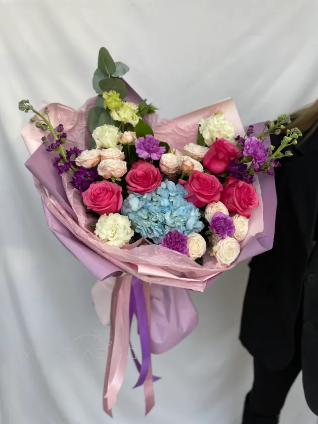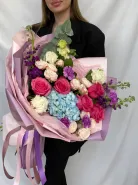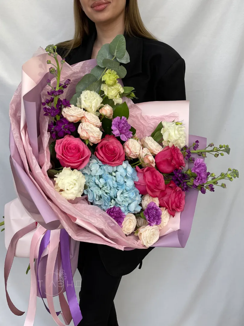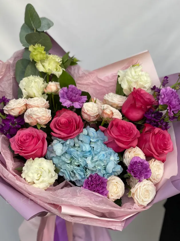 Букет «Яркие эмоции» — в его составе диантус, эустома, розы, эвкалипт, кустовые розы, маттиола и гортензия создают красивую палитру и насыщенный аромат. Такой букет идеально подойдет для яркого праздника или чтобы порадовать близкого человека.