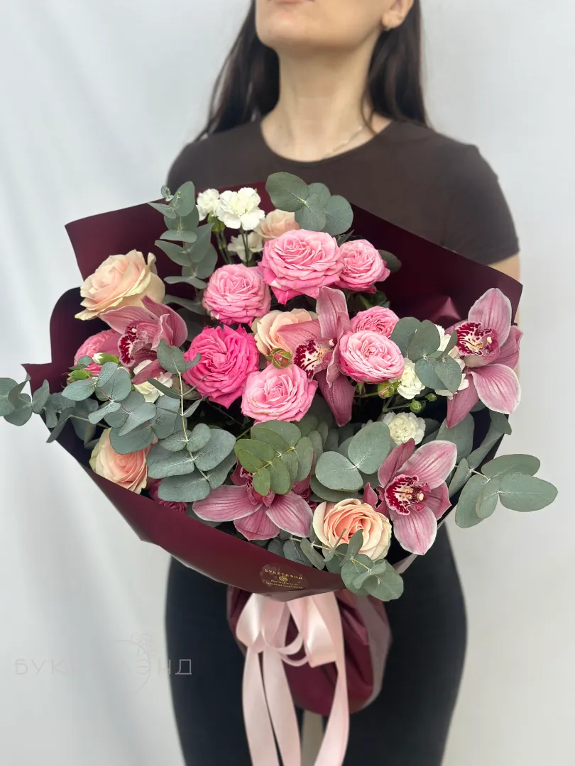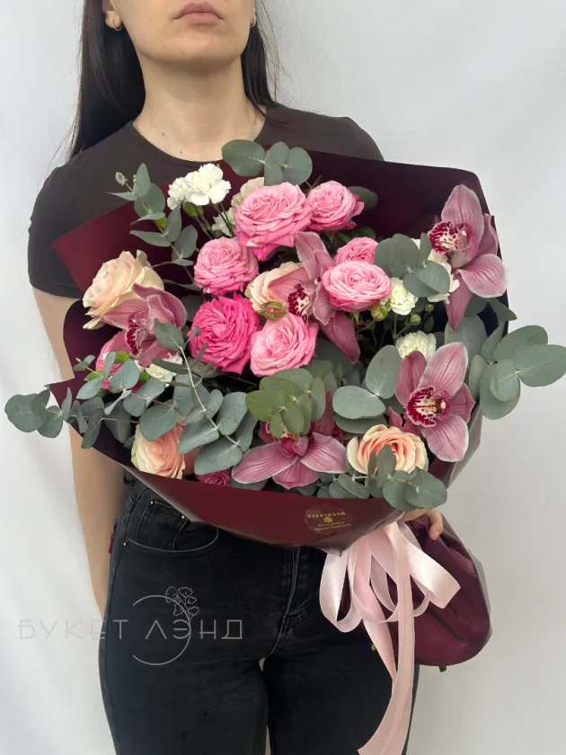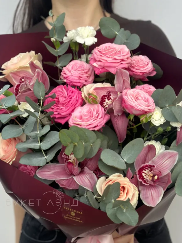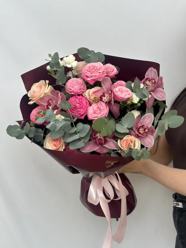 Погрузитесь в атмосферу романтики с букетом «Кармелита», созданным для особых моментов. В его композицию входят изящные розы и кустовые розы, придающие букету объем и нежность. Диантусы добавляют ярких акцентов и свежести, подчеркнув гармонию цветов. Аромат эвкалипта создаёт приятную атмосферу и дополняет композицию своим уникальным запахом. Элегантное оформление подчеркивает изысканность и заботу о деталях. Завершение образа — экзотический цимбидиум, придающий букету статус и неповторимость. Такой букет станет идеальным подарком для тех, кто ценит красоту и утонченность.