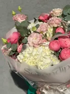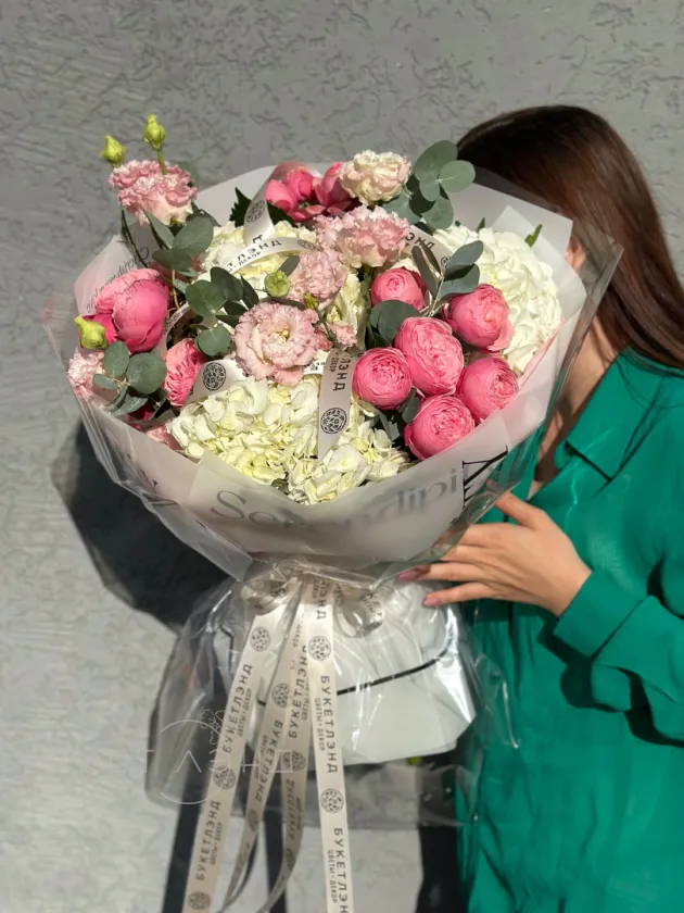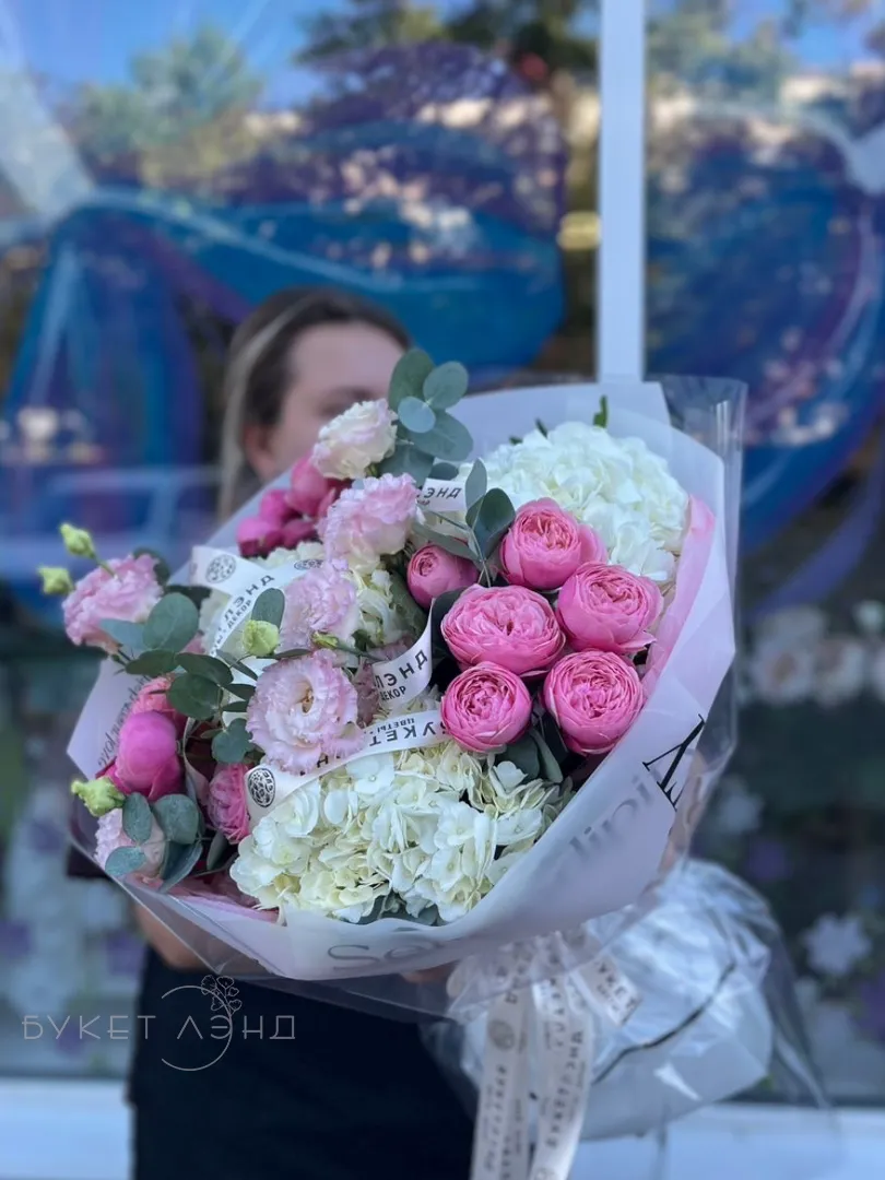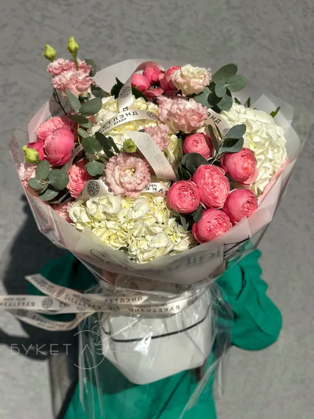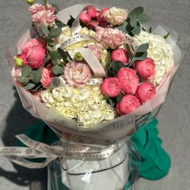 Этот букет состоит из кустовых роз, которые придают ему романтику и нежность. Гортензии добавляют объем и текстуру. Эвкалипт и писташ обрамляет композицию своей свежей зеленью, а эустомы вносят элегантный акцент.
