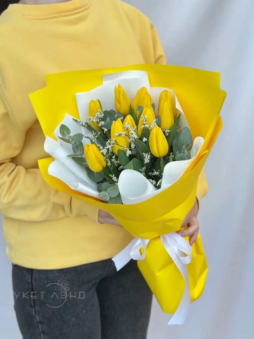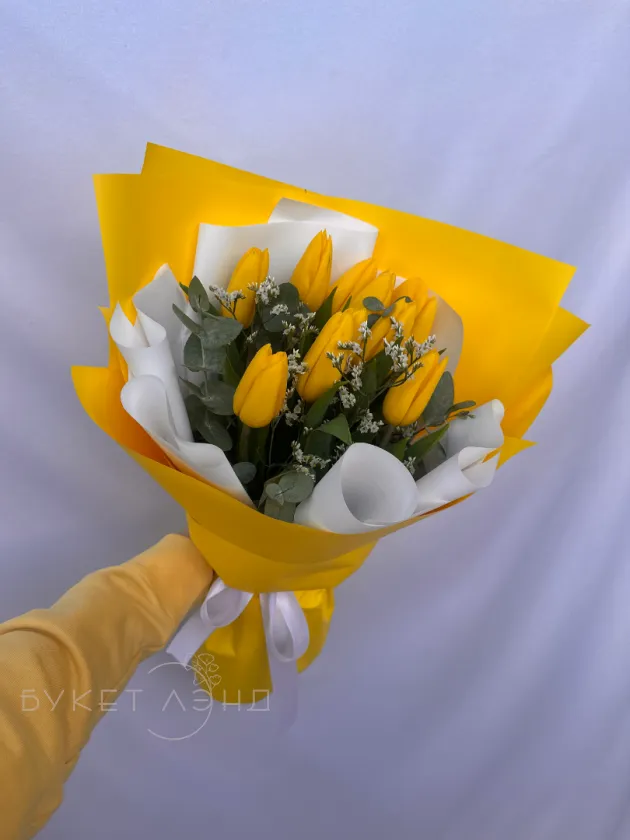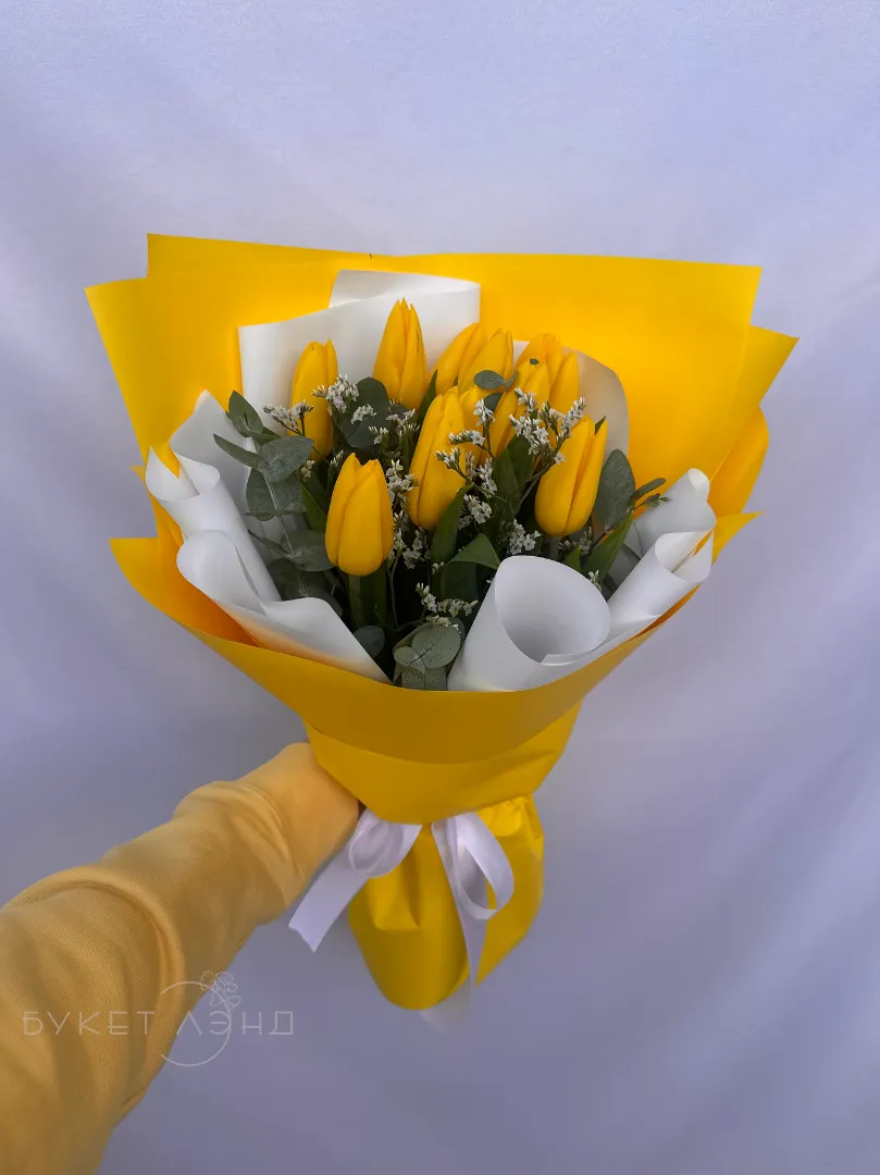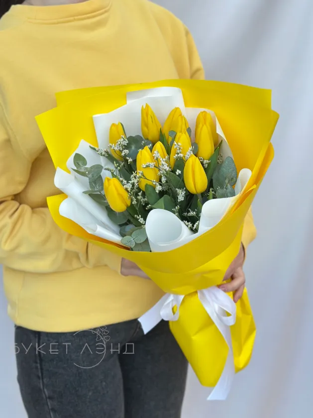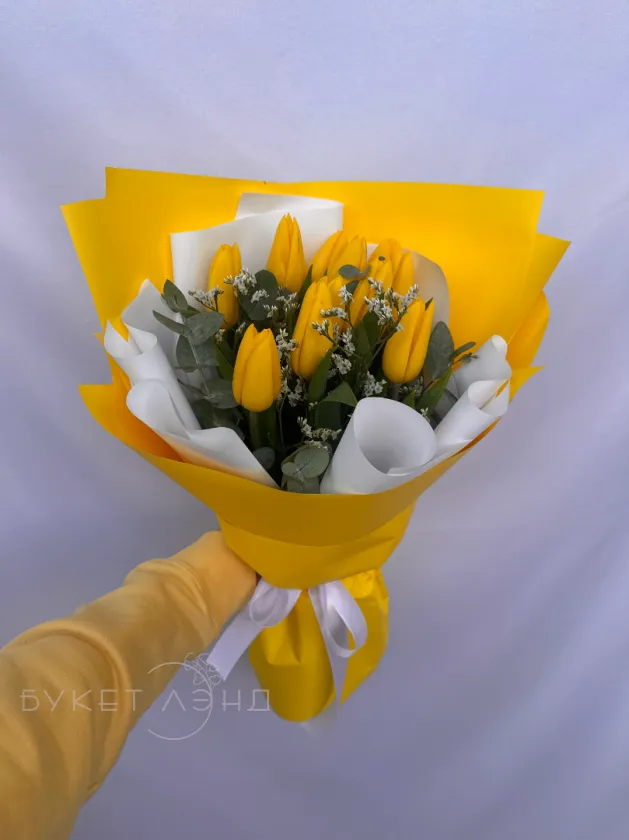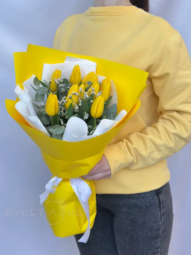 Букет из 11 тюльпанов «Солнечные лучи» – яркое и элегантное решение для любого особого случая. В его составе свежие тюльпаны, красиво оформленные в сочетании с элегантным эвкалиптом, добавляющим изысканности. Подарите себе или близким кусочек лета и солнечного настроения вместе с этим букетом.