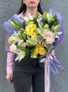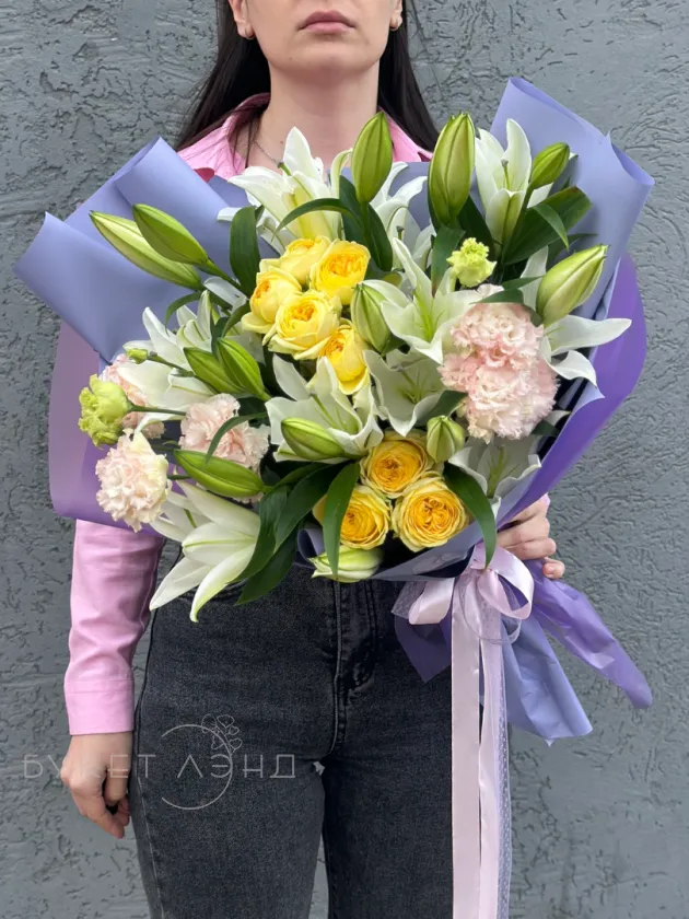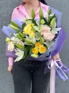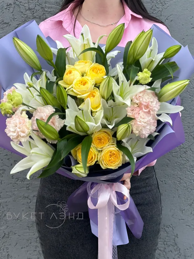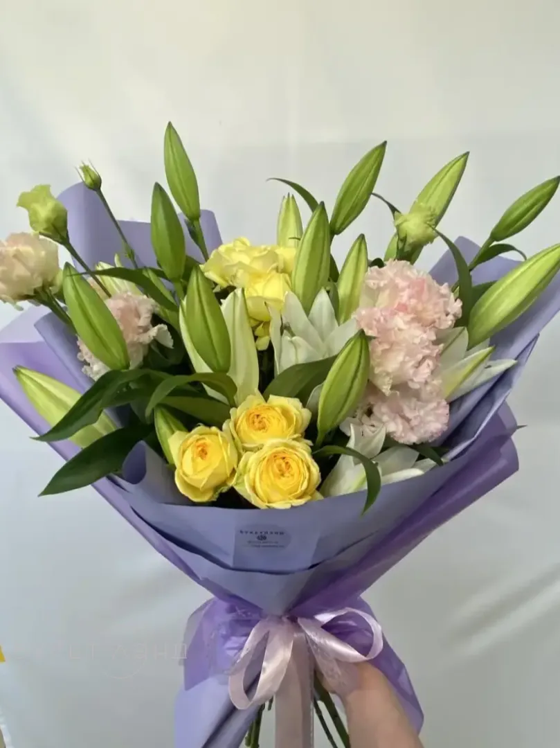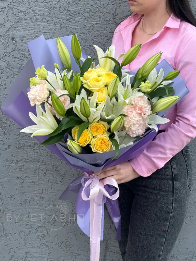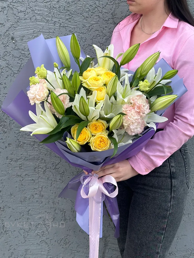 Погрузитесь в атмосферу свежести и элегантности с нашим букетом из лилий, кустовой розы и диантусов. Каждый цветок тщательно подобран, чтобы создать гармоничный и изысканный ансамбль.