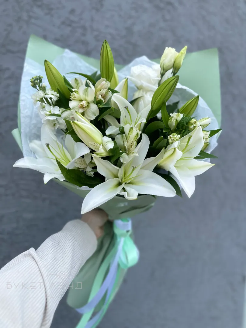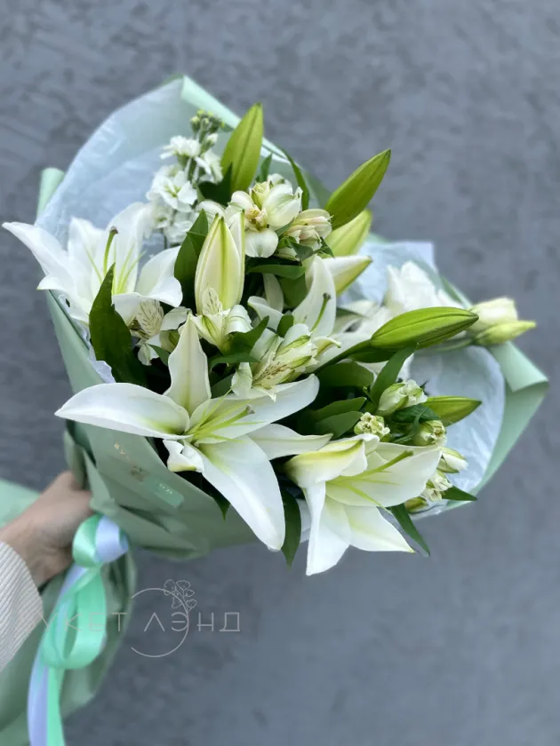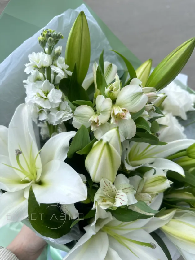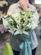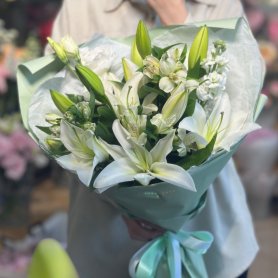 Этот изысканный сборный букет станет идеальным подарком, сочетая в себе элегантность лилии, нежность эустомы и свежесть маттиолы. Каждый цветок тщательно отобран и гармонично дополнен зеленью рукуса, создавая неповторимую композицию. Профессиональная работа наших флористов гарантирует, что этот букет принесет радость и восхищение своему получателю.