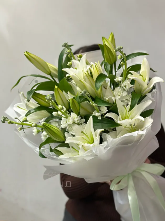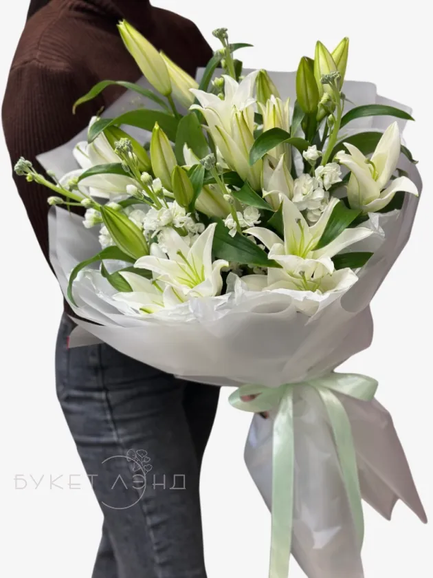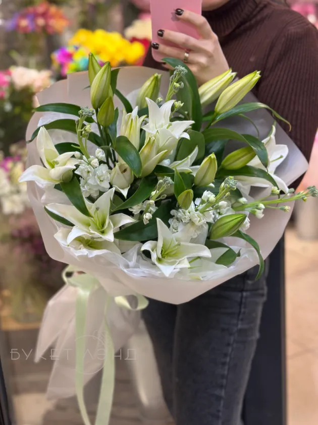 Очаровательный букет из изысканных лилий и ароматной матиолы идеально подчеркнет ваше особое настроение. Элегантное оформление добавит завершенность и стильность композиции. Этот букет станет прекрасным подарком для любого повода.