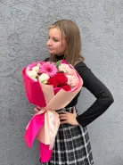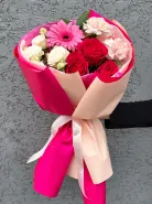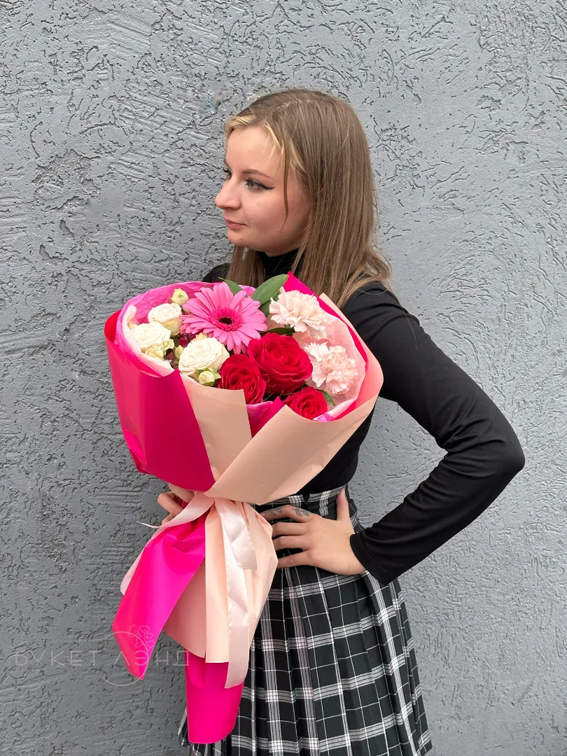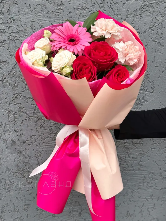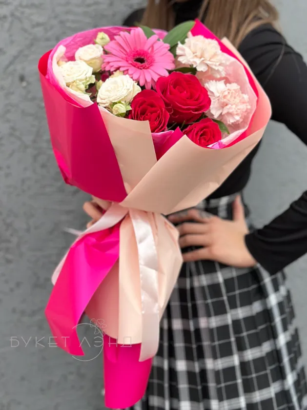 Кустовая роза добавляет романтичности и изысканности, гербера — яркие акценты и жизнерадостность, а диантус и одноголовая роза придают букету воздушность и утонченность. Такой букет идеально подходит для подарка на любой повод, будь то день рождения, юбилей или просто чтобы поднять настроение.