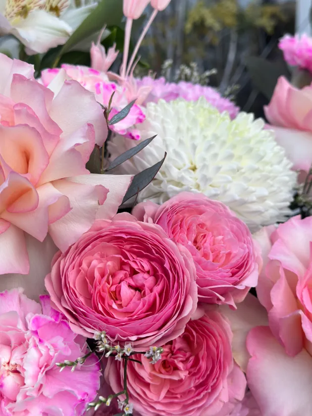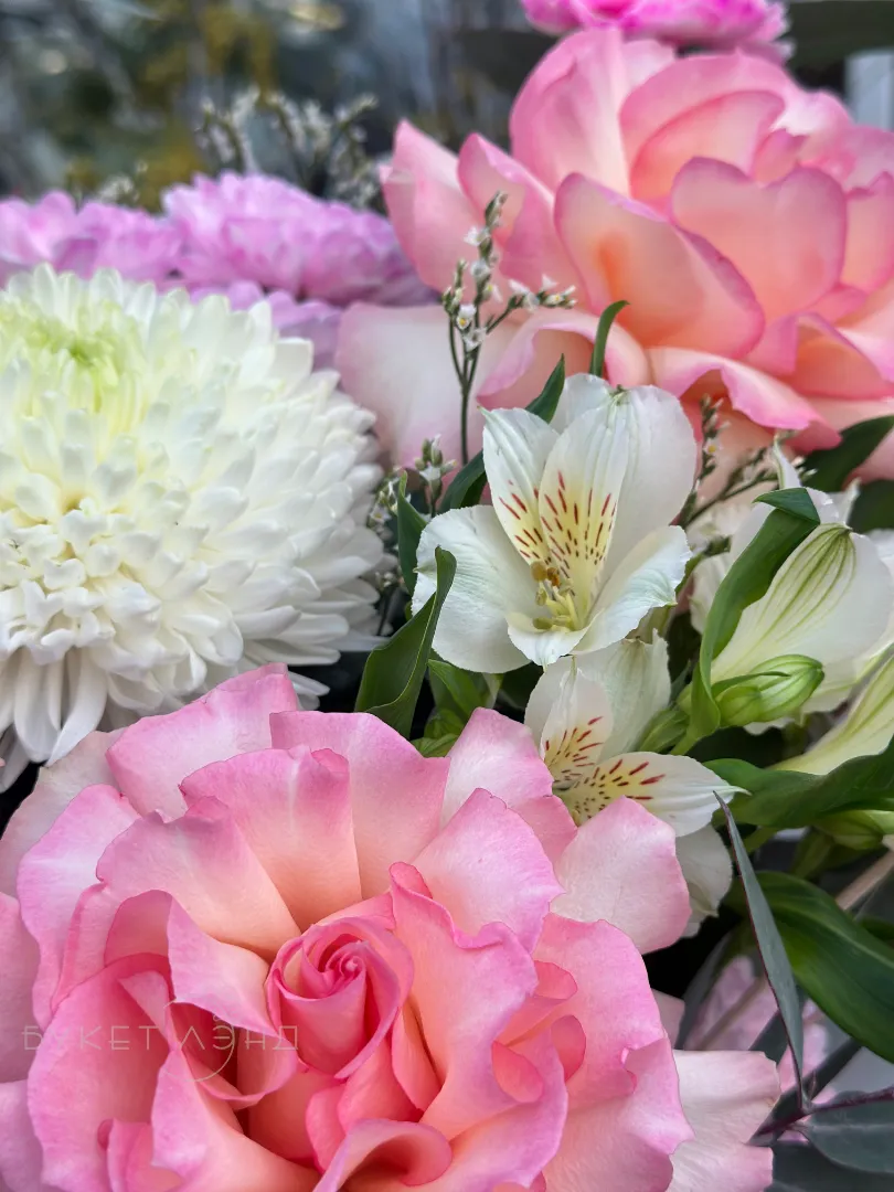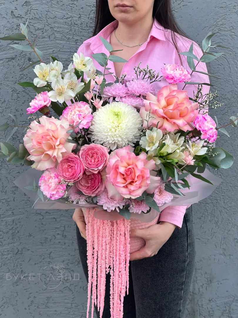 Подарите себе или близким настоящее «Розовое наслаждение» – роскошную композицию, созданную из нежных кустовых роз, классических роз, утонченной альстромерии, изящного диантуса и воздушной хризантемы, дополненную акцентами лимониума и свежестью эвкалипта. Эта изысканная композиция, искусно оформленная и закрепленная в оазисе, представлена в элегантной корзине, готовая стать подарком для любого случая.