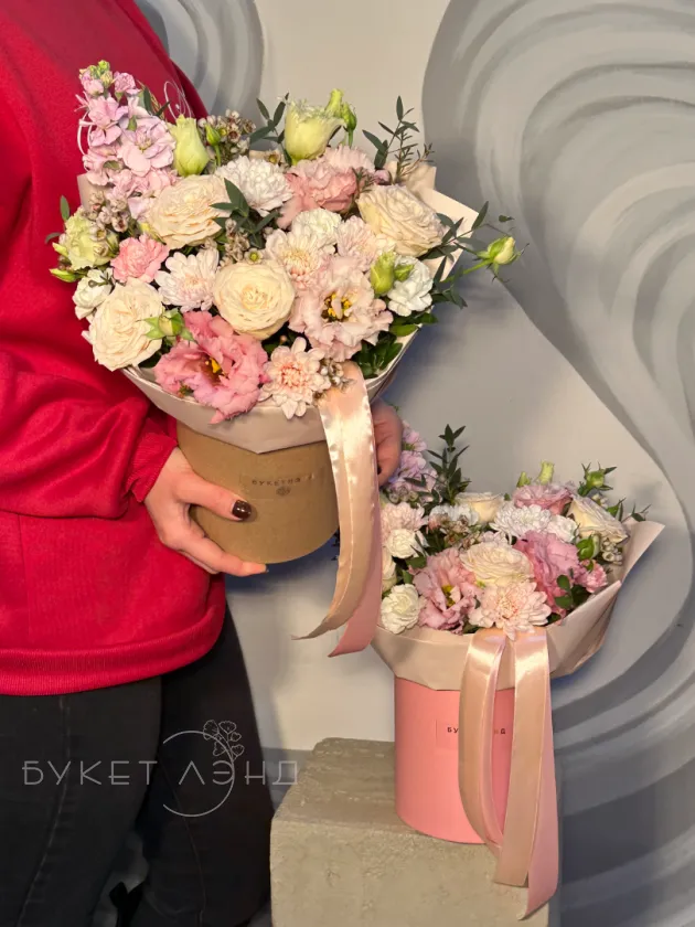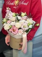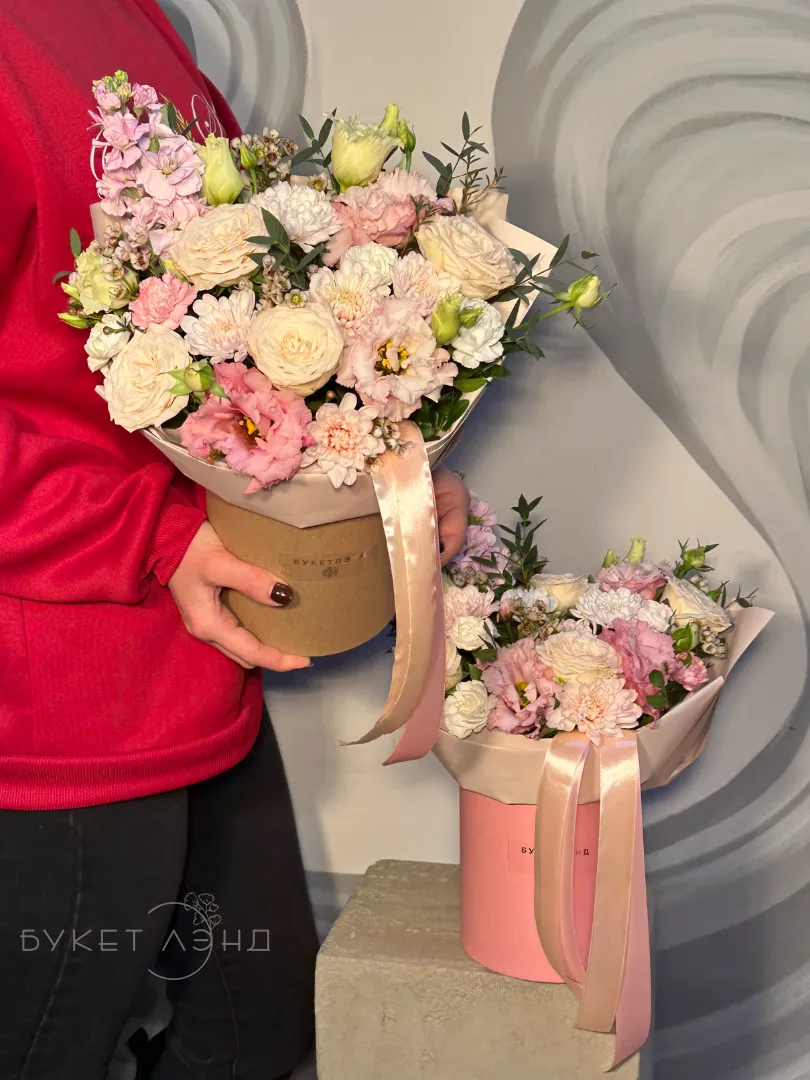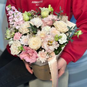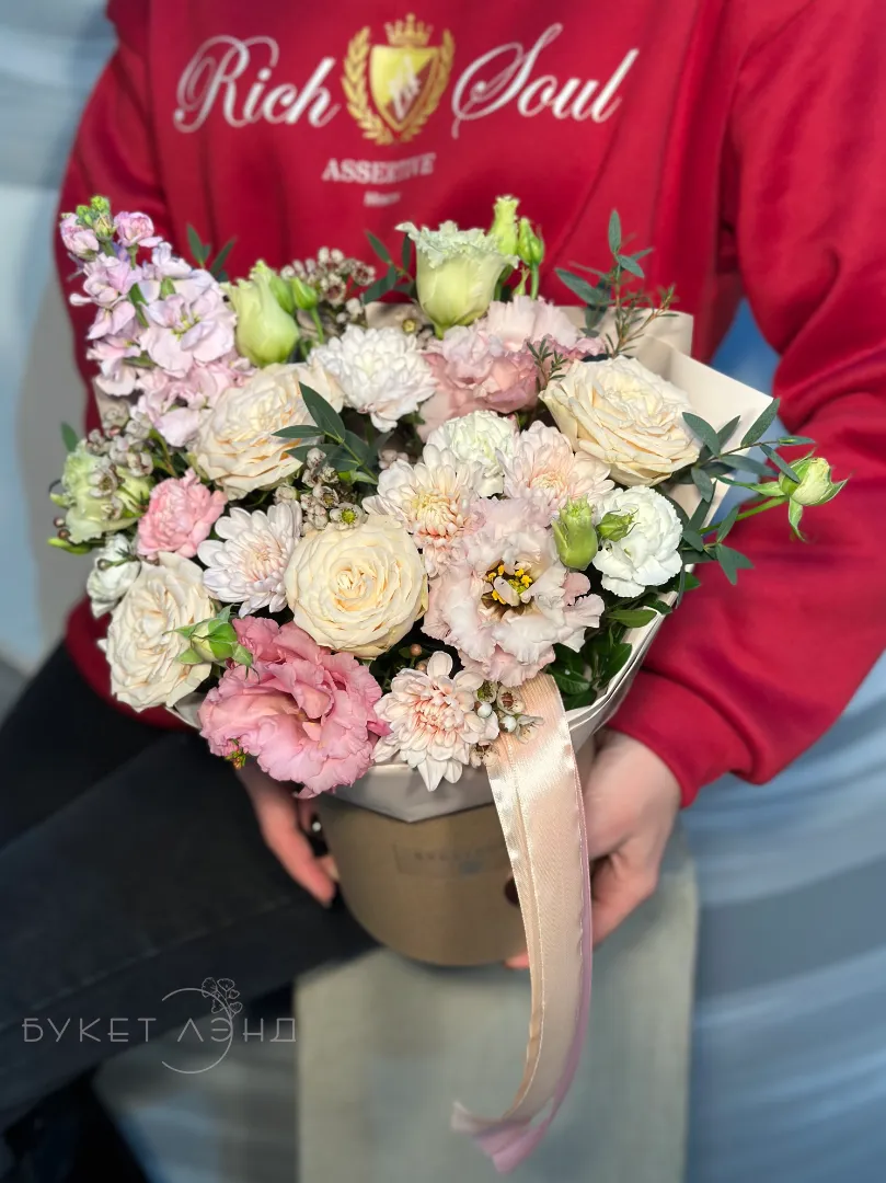 Цветы в коробке «Комплимент» — это яркое и элегантное сочетание природы и искусства. Присутствуют зеленые элементы — эвкалипт, Танацетум, рускус и писташ, добавляющие свежести и текстурности. Акцент сделан на изящных цветах и нежных оттенках, что делает подарок особенно привлекательным. Идеально подойдет для любого случая и порадует получателя своей красотой.