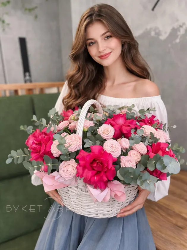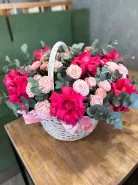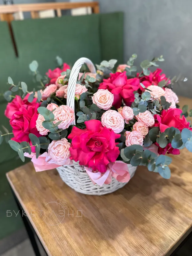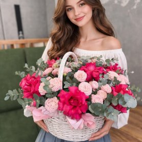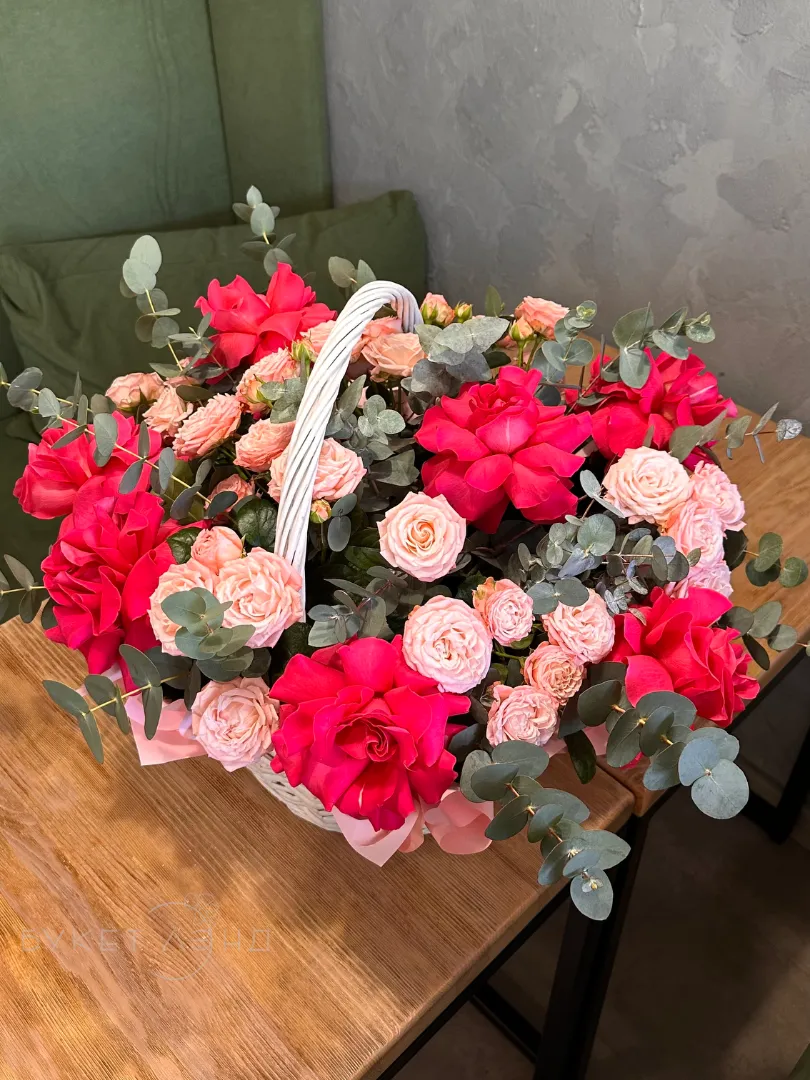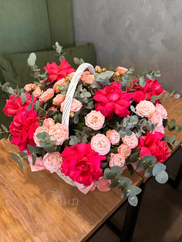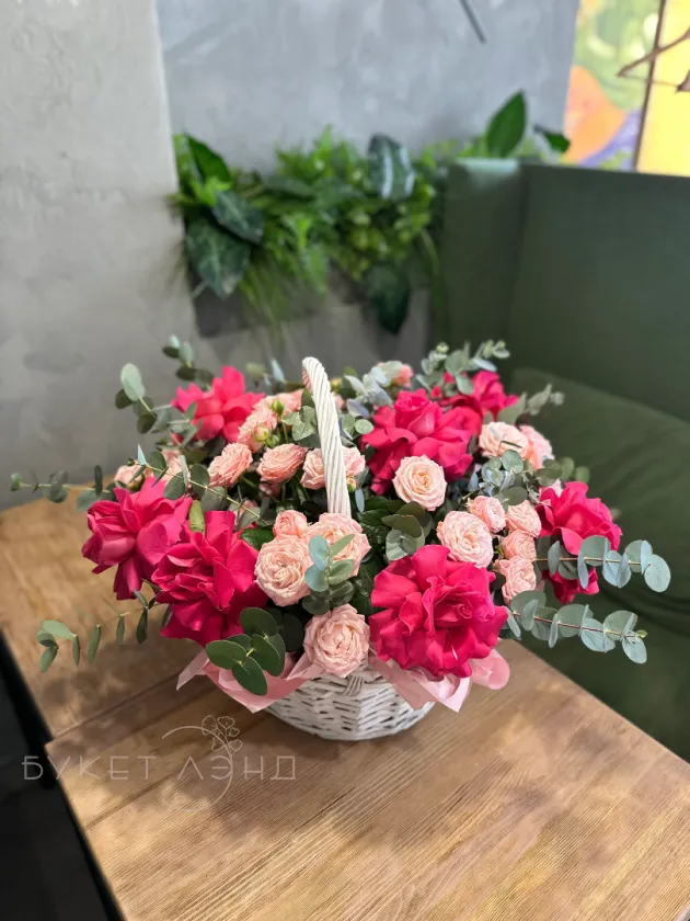 Восхитительная , большая корзина, наполненная нежными кустовыми розами и элегантными розами, покорит своим изяществом. Оазис, бережно вплетенный в композицию, подчеркивает свежесть и долговечность каждого цветка. Зелень эвкалипта добавляет аромат и завершает эту композицию, созданную для самых особенных моментов.
