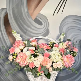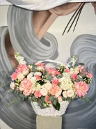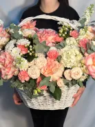 Эта корзина с цветами под названием «Восхищение» станет прекрасным подарком для любого случая. В её составе нежные розы и эустома, гортензия и кустовая роза добавляют объема и насыщенности композиции. Яркая хризантема придает яркости и свежести, а гиперикум и диантус подчеркивают разнообразие оттенков. Маттиола и эвкалипт добавляют текстуры и утонченности, создавая ощущение природной свежести.
