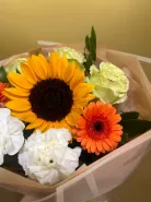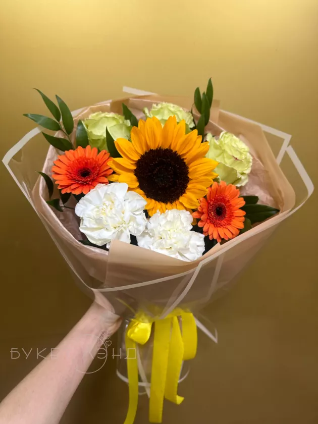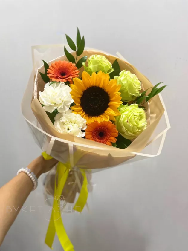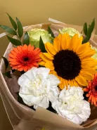 Этот букет сочетает в себе яркие и нежные оттенки. Основу составляют свежие герберы и диантусы, которые придают ему легкость и игривость. Один крупный подсолнух добавляет солнечное настроение, а три розы вносят романтический акцент. Рускус служит зелёным фоном, подчеркивая красоту цветов и создавая гармоничное сочетание. Букет выглядит ярко и стильно, идеально подходя для любого повода.