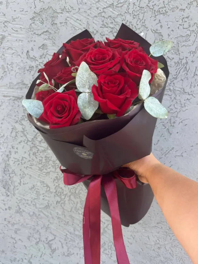 Букет из 9 роз с эвкалиптом «Симфония чувств»