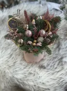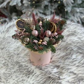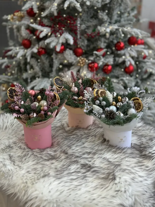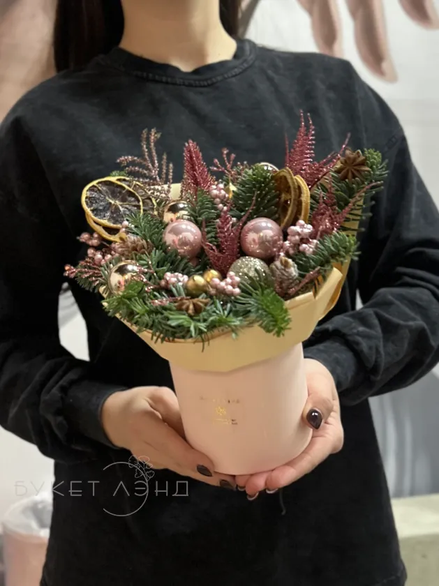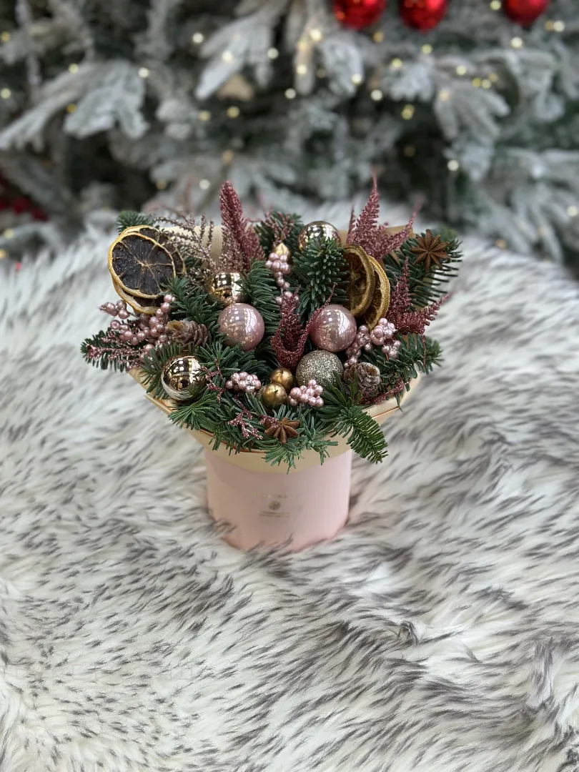 Букет «Сказка о зиме» — это изысканная новогодняя композиция, выполненная внутри шляпной коробки. В центре оформления расположены искусственные ягоды, придающие композиции яркий и праздничный вид. Работа флориста тщательно продумана, чтобы подчеркнуть зимнюю атмосферу и ёлочную магию. В композицию добавлены новогодние шары разных размеров и цветов, создавая ощущение праздника и радости. Такая композиция отлично подойдет для украшения интерьера, создавая уют и волшебство в новогодние праздники.