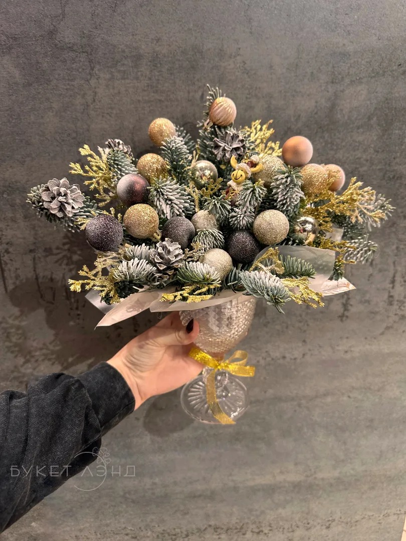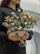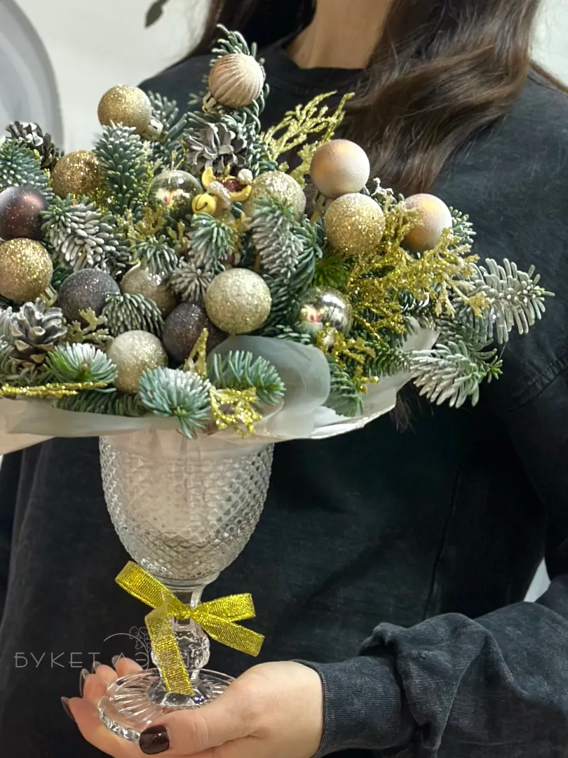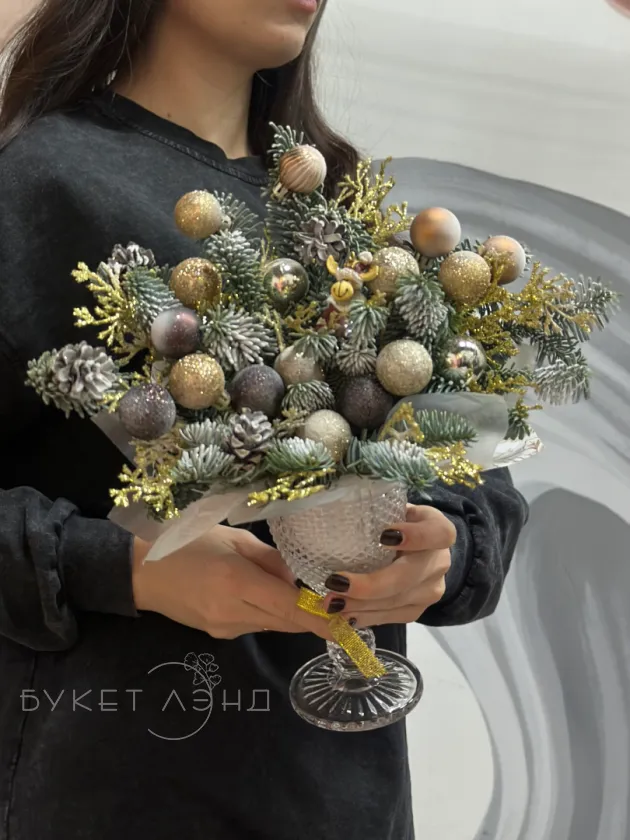 Подарите себе праздничное настроение с ярким украшением в виде Нобилиса в фужере «Праздник к нам приходит!». Элегантный дизайн сочетает в себе новогодние шары, фигурку и шишки, создавая атмосферу уюта. Оформление дополняет декор, делая композицию насыщенной и праздничной. Такой подарок станет отличным акцентом любого новогоднего интерьера и ярким украшением стола.