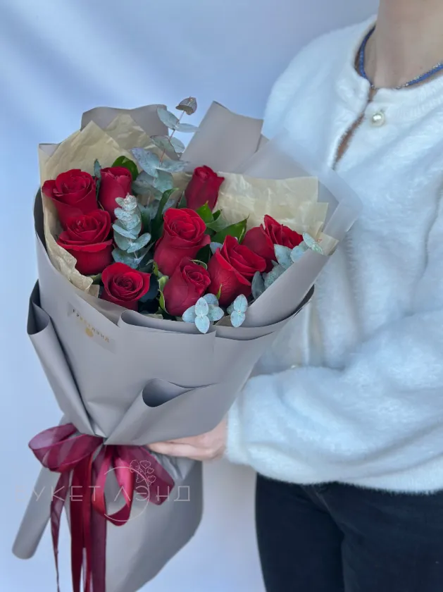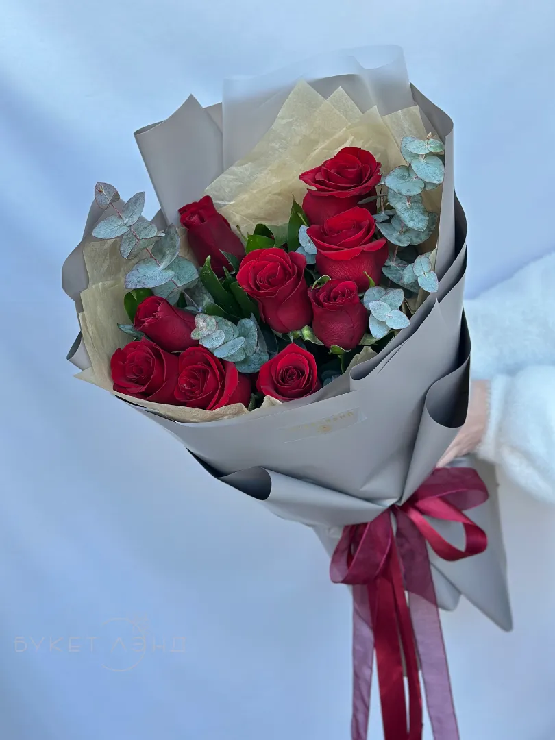 Букет из 11 роз с эвкалиптом «Любовь в каждом лепестке»