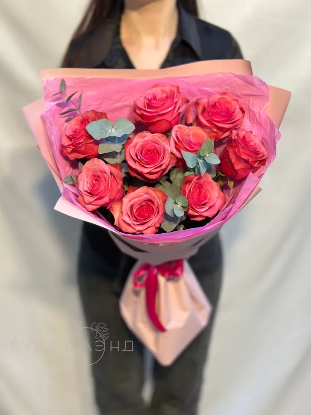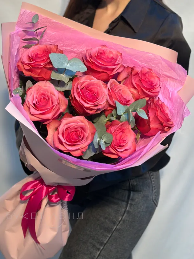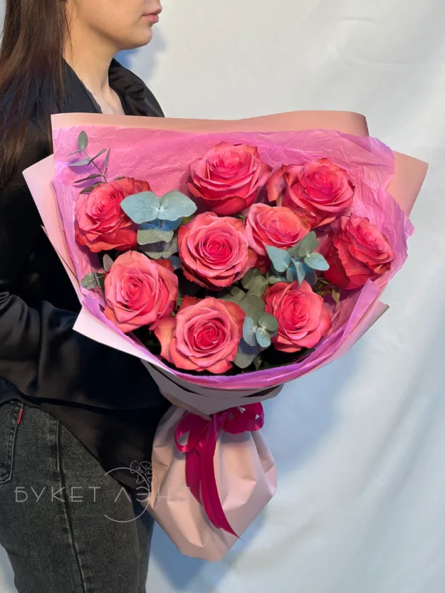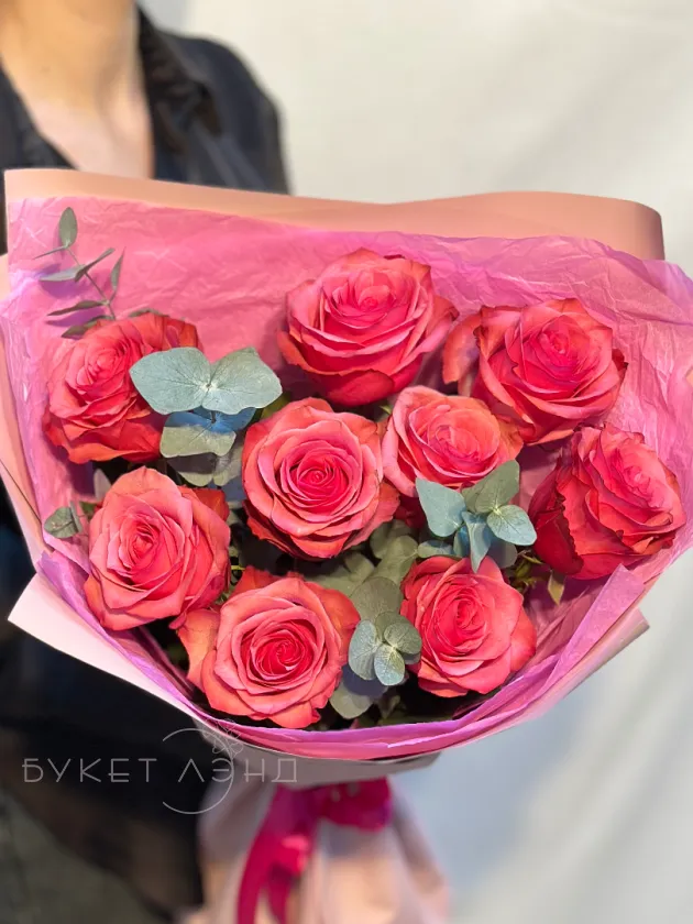 Букет из 9 роз с эвкалиптом «Розовый фламинго»