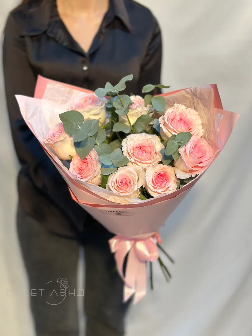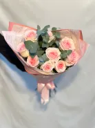 Букет из 9 роз «Зефирка» с добавлением зелени эвкалипта создает нежное и элегантное впечатление. Мягкие розовые оттенки и аромат эвкалипта делают этот букет идеальным подарком для особых случаев. Он красиво оформлен и готов приятно удивить любого получателя.