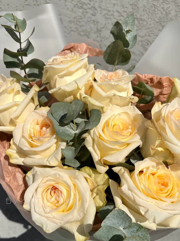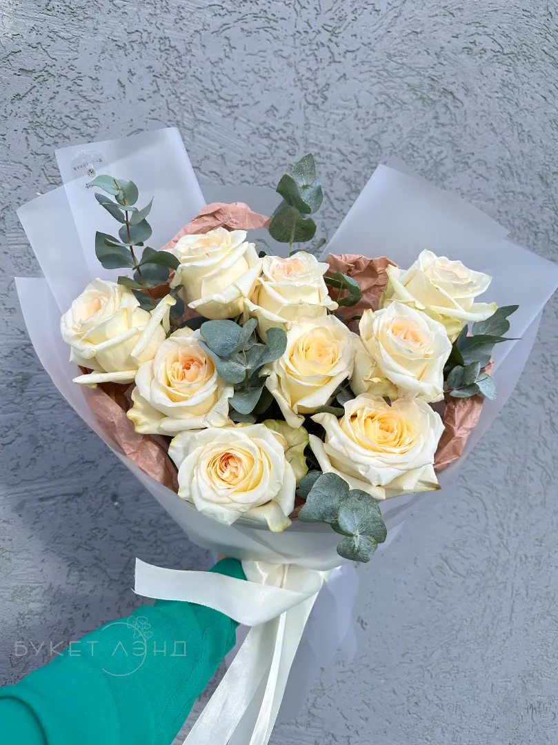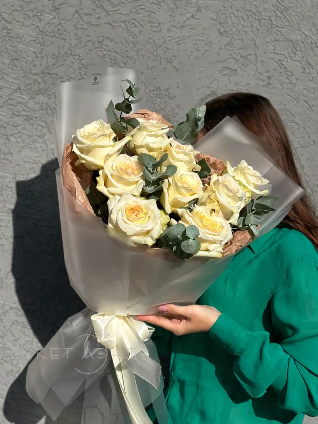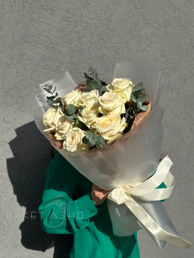 Букет из 9 роз с эвкалиптом «Лунный свет»