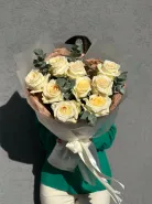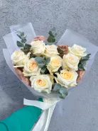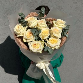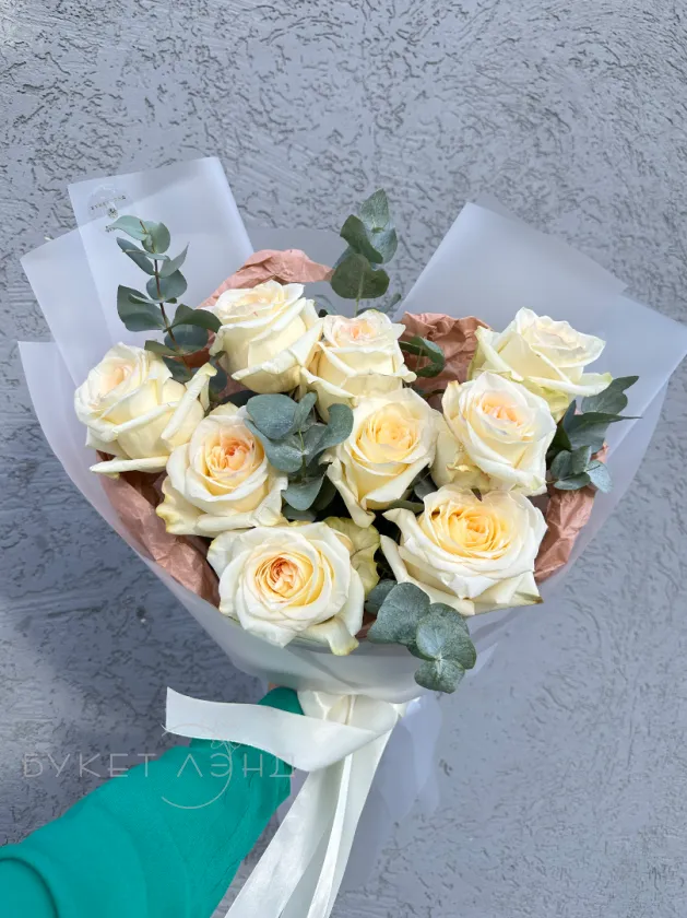 Букет из 9 белых роз, окруженных нежными веточками эвкалипта, создает атмосферу утонченной элегантности. Розы символизируют чистоту и искренность, а эвкалипт добавляет свежести и лёгкости, с его зелеными листьями, которые прекрасно контрастируют с мягкими лепестками цветов. Такой букет идеально подходит для романтических моментов, свадеб или как знак уважения и любви.