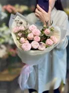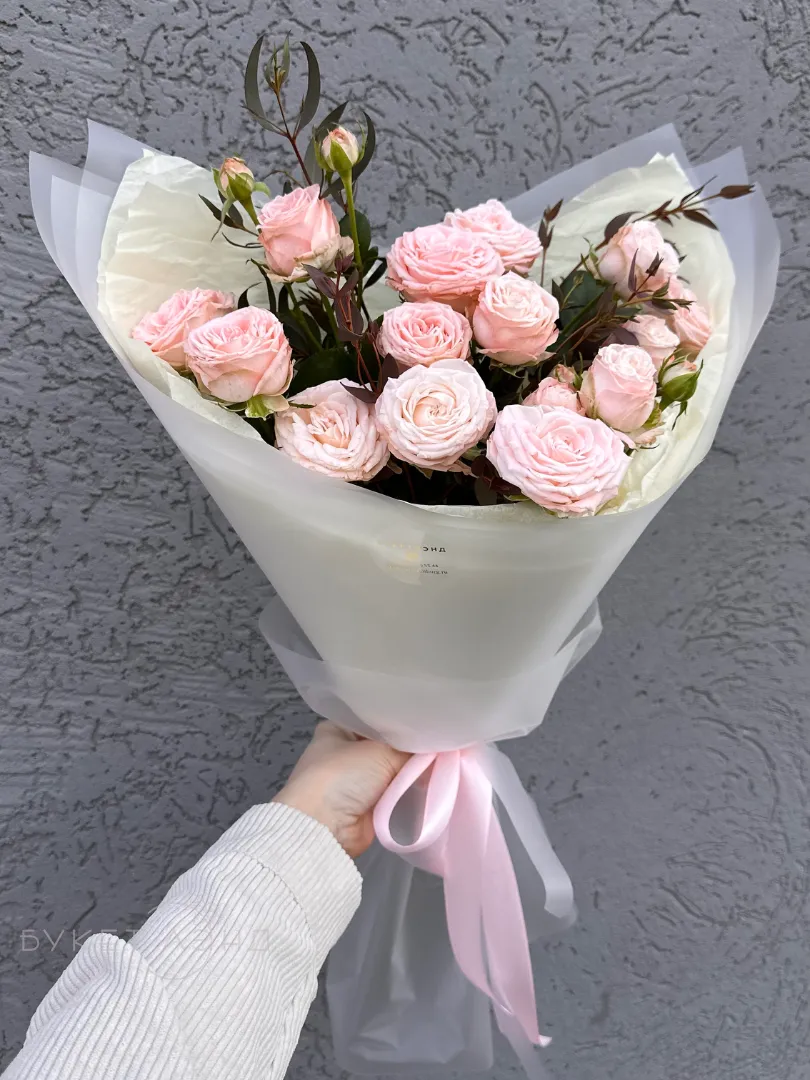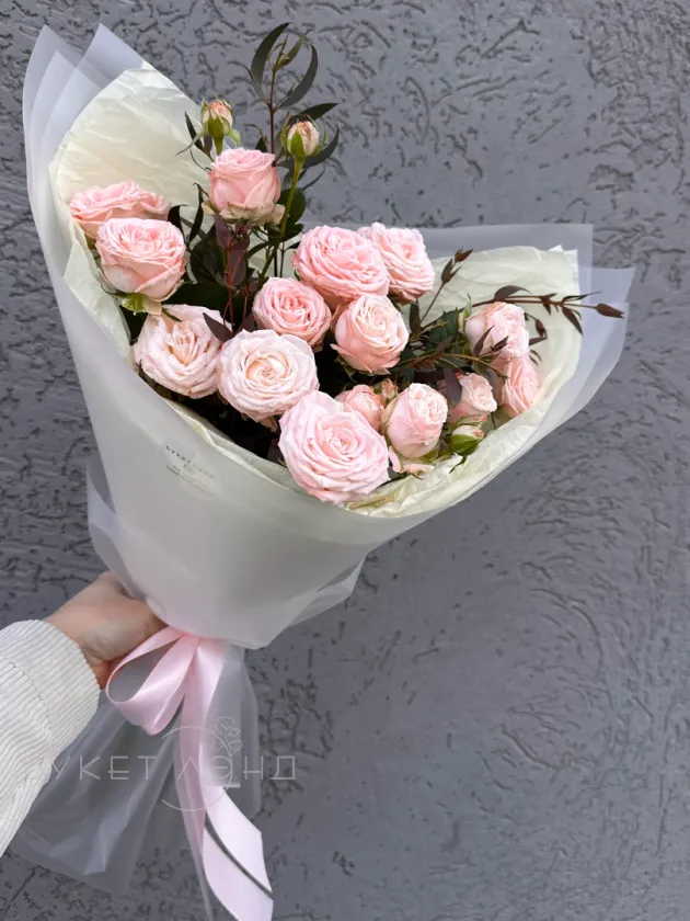 Идеальный выбор для тех, кто ценит изящество в каждой детали – мини-букет из трёх нежных кустовых роз, окутанных эвкалиптом. Его компактный размер позволяет легко вписать эту миниатюрную композицию в любой интерьер или преподнести как трогательный знак внимания. Каждый цветок тщательно подобран, а лёгкий аромат эвкалипта добавит свежести и изысканности.